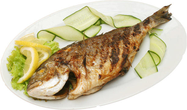 Grilled fish sea bream on BBQ with vegetables