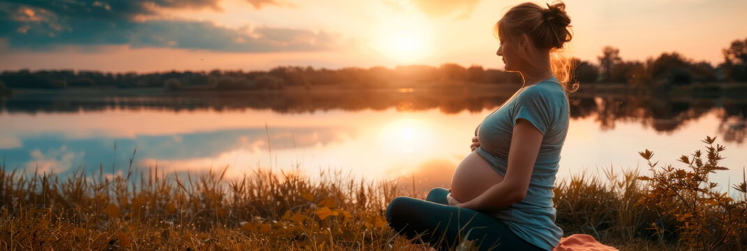 A serene mother practices a gentle yoga pose on the shore of a calm lake at sunset, reflecting peace and balance.