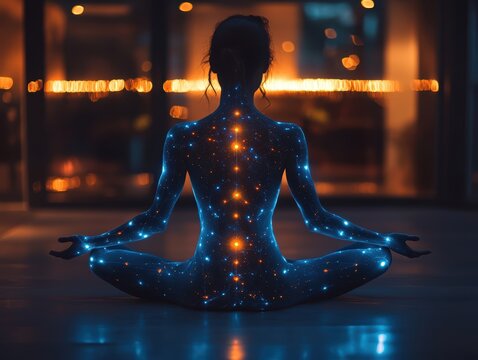Group meditating with futuristic hud wellness interface for mindfulness and breath