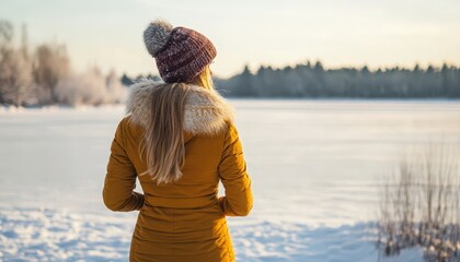 Woman in winter coat standing on cold beach