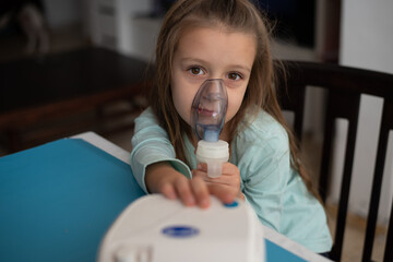 Portable breathing machine using at home. Girl presses by one hand  button and includes apparatus, hold by another hand breathing mask. Device for asthma and recovering after coronavirus.