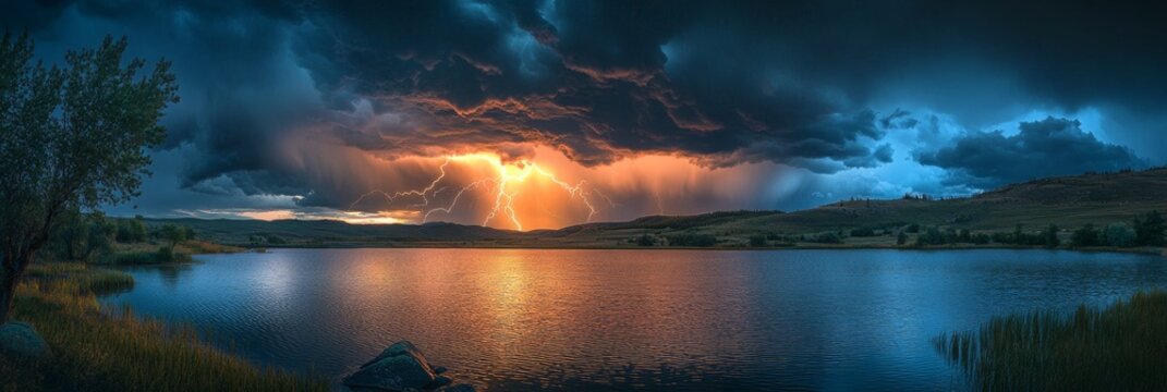 Dramatic thunderstorm with intense lightning over rural landscape