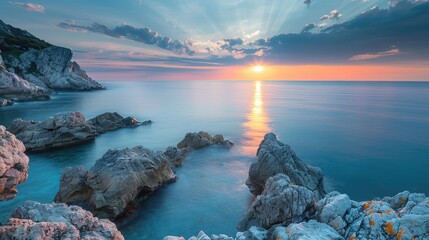 A breathtaking coastal sunset with sun rays reflecting on the calm ocean, rocky shoreline, and dramatic clouds in the sky