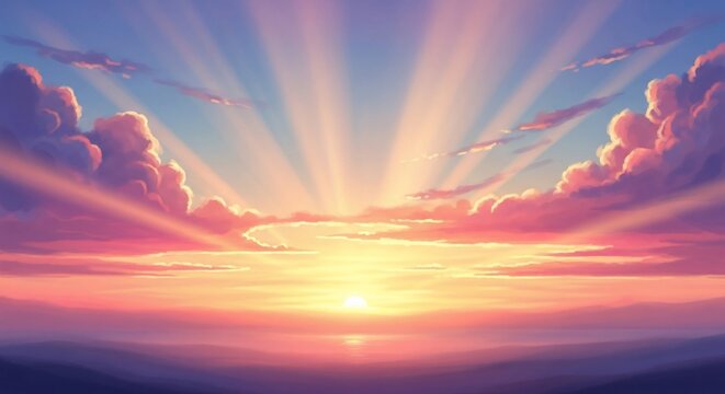 A breathtaking sunset over the ocean, with vibrant colors and rays of light piercing through fluffy clouds.