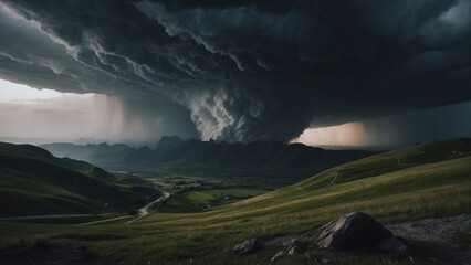 Scenic landscape of heavy clouds and silhouettes of mountains