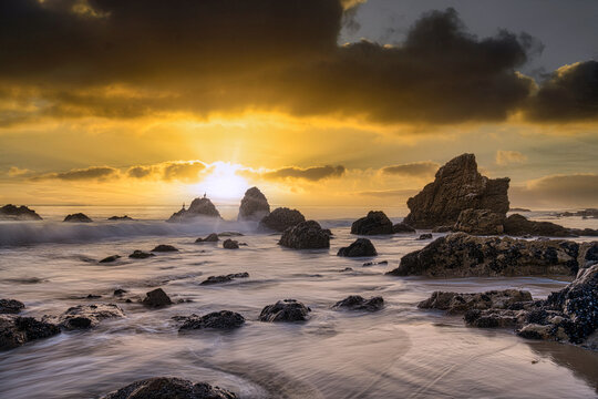 Breathtaking coastal sunset over rugged shoreline