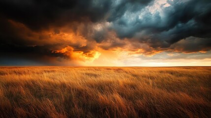 A vast golden prairie lies beneath stormy skies, illuminated by the vibrant hues of a fiery sunset, contrasting peace and chaos in this mesmerizing landscape.