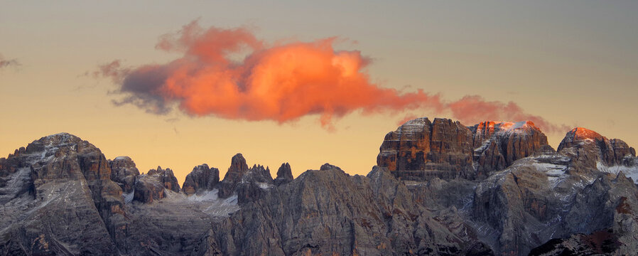 Brenta Dolomites reflected in the Ritorto lake at sunset, Adamello Brenta Natural Park, Trentino, Italy.