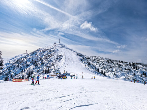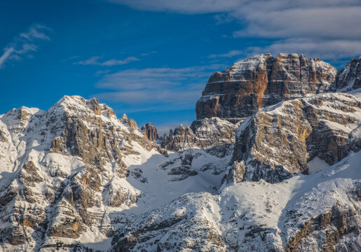 Famous Italian Alps Brenta Dolomites, snow on the slopes of the Alps Madonna di Campiglio, Pinzolo, Italy. Ski resorts in Italy. January 2023