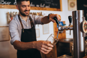 smiling barman pouring beer in a bar. Bearded courageous man pours you a foaming drink. Golden tap for draft beer