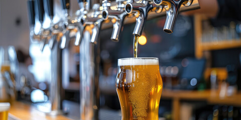 Cold draft beer pouring into glass in cozy bar setting with bokeh lights