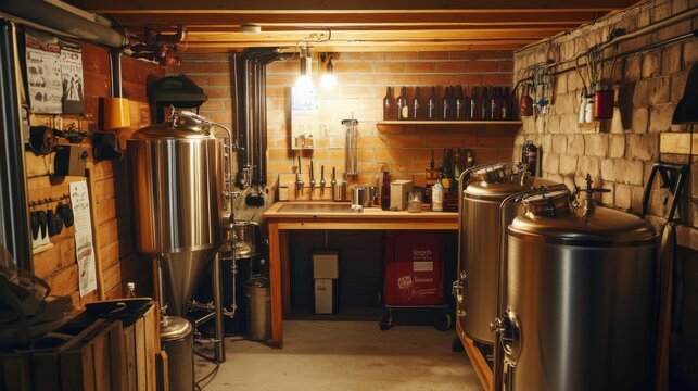 A carefully set up home brewing setup, Fermenters and brewing equipment in a cozy cellar, Craft beer style