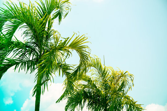 Coco palm tree brght toned photo. Tropical vacation destination place.