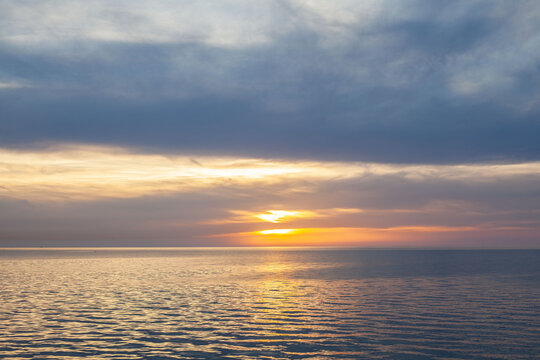 Sunset and sea. Evening landscape of blue cloudy sky with brght yellow sunlight