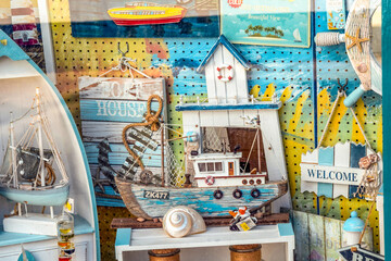 Colourful glass collectables and bric a brac in charity shop window interior viewed from inside, charity chic for recycle, reuse and re purpose.