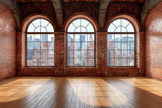 empty room with wooden floors and red brick walls, featuring three arched windows that offers city views