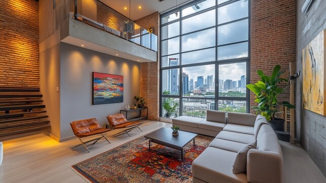Modern loft apartment interior with city view, large windows, and exposed brick walls.