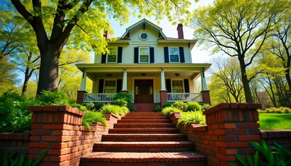 Charming two-story house with brick steps and lush green landscaping.  Perfect suburban home.