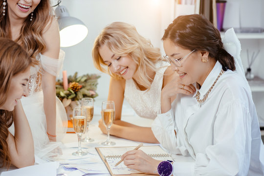 Three women, a young beautiful bride and her best friends, are eagerly looking at a piece of paper with wedding plans.