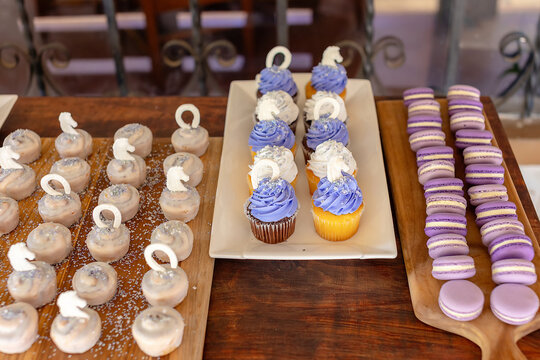 Elegant dessert table featuring cupcakes with purple frosting, mini cakes and rows of lavender macarons. Perfect bakery display for weddings, parties and celebrations.