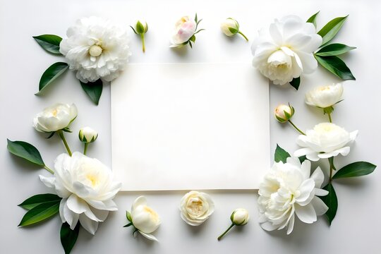 Template design with white peonies and white background with copy space. Classic white peony, ivory rose flowers for wedding invitation. Central negative space within banner