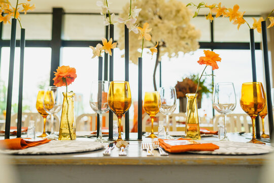 Faint view of a mimosa bar with colorful fruit juices at the bridal shower.