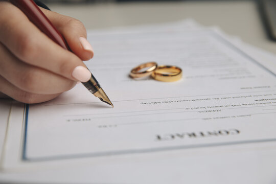 Woman signing marriage contract, closeup.