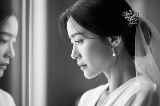 Asian bride gazing thoughtfully while standing by a window
