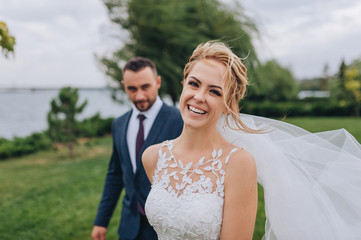 Blonde and smiling bride and bearded groom walk, holding hands, in the park with green grass and willows. Wedding portrait of beautiful newlyweds. Wedding photography.