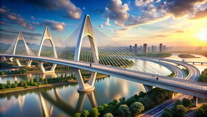 A bridge in the city at night. The bridge against the sky during the blue hour. Architecture and design. Amsterdam, Netherlands. Panoramic photography for design and background..