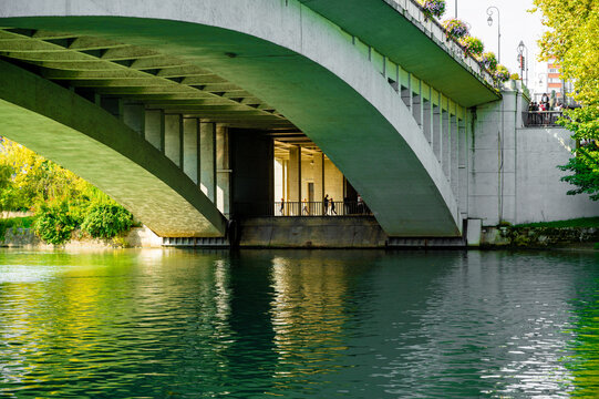 Two individuals are performing stretching exercises on a bridge while enjoying a morning workout together. Their activity encourages a recreational and healthy lifestyle.