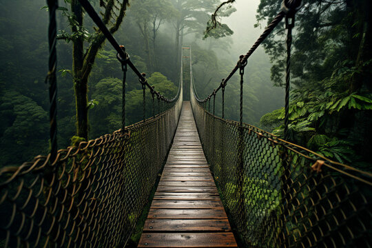 A long suspension bridge made of wooden planks extending through a dense forest made with generative AI