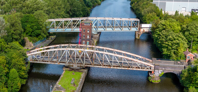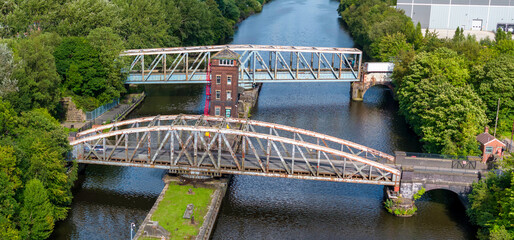 Aerial footage of Barton Swing Bridge over Manchester canal in Greater Manchester England