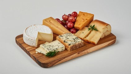 Assorted cheeses arranged on a wooden board against a white backdrop