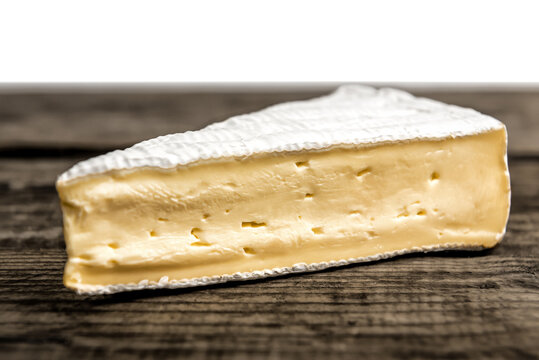 Triangle of delicious soft brie cheese on wooden board