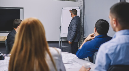 Experienced boss 50s coaching professional employees during involved briefing in board room, mature corporate director in formal suit teaching colleagues explaining business strategy near flipchart