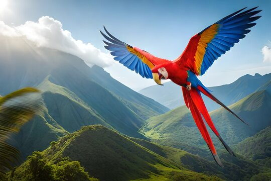 Vibrant bird flying amongst tropical foliage
