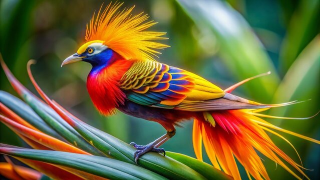 Exotic and vibrant bird of paradise displaying its colorful plumage , tropical, beauty, nature, vibrant, colorful, bird, paradise