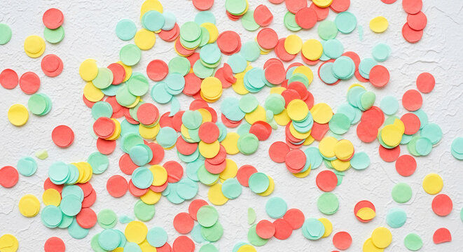 Scattered pastel confetti circles on white background, creating festive and cheerful mood, ideal for celebration or party invitations