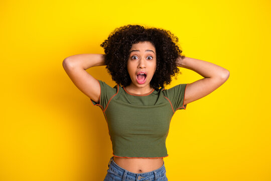 Surprised young woman with curly hair making a shocked expression against a bright yellow background