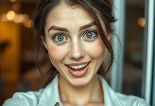 Close-up portrait of a smiling woman with short curly hair, exuding confidence and happiness on a dark background.