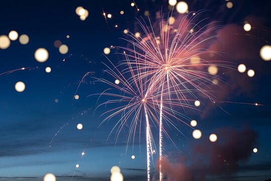 Vibrant fireworks exploding in night sky with sparkling bokeh lights