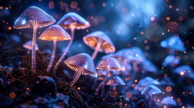 A lush green forest is home to a cluster of mushrooms, its surface dotted with various cap sizes and colors, predominantly blue