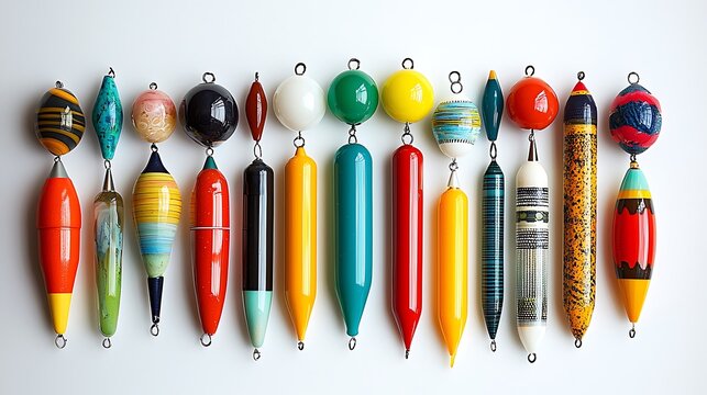 Row of colorful fishing bobbers with unique patterns and hooks, hanging vertically against white background