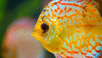 Close-up view of a vibrant discus fish with intricate patterns, showcasing its beauty.