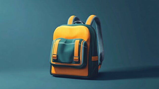 Green backpack with school stationery including scissors and pens on a bright yellow background