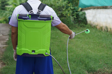 A man carry bright green backpack sprayer, wearing gloves, and holding a spray wand in a grassy area. The image represents agricultural equipment used for spraying pesticides, herbicides, fertilizers.