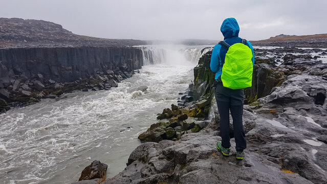A hiker with a bright green backpack cover stands on a mossy rock, overlooking the turbulent Selfoss waterfall as it cascades through the dramatic basalt rock formations of a rugged Icelandic canyon.