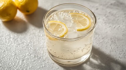 Elegant Top down view of sparkling water in a glass with circular ripples and lemon slices casting shadows on a textured gray background
