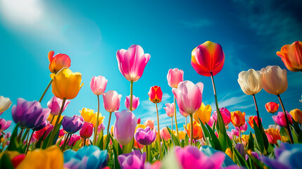 A vibrant field of multicolored tulips in full bloom under a bright